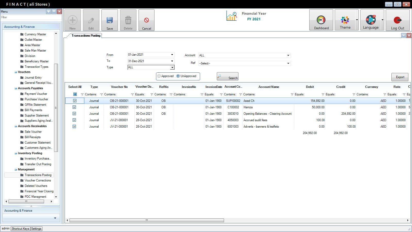 To view and control the vouchers, go to the “Transaction Posting”, choose the dates to view the vouchers related to it, you can choose to view the approved or unapproved accounts.