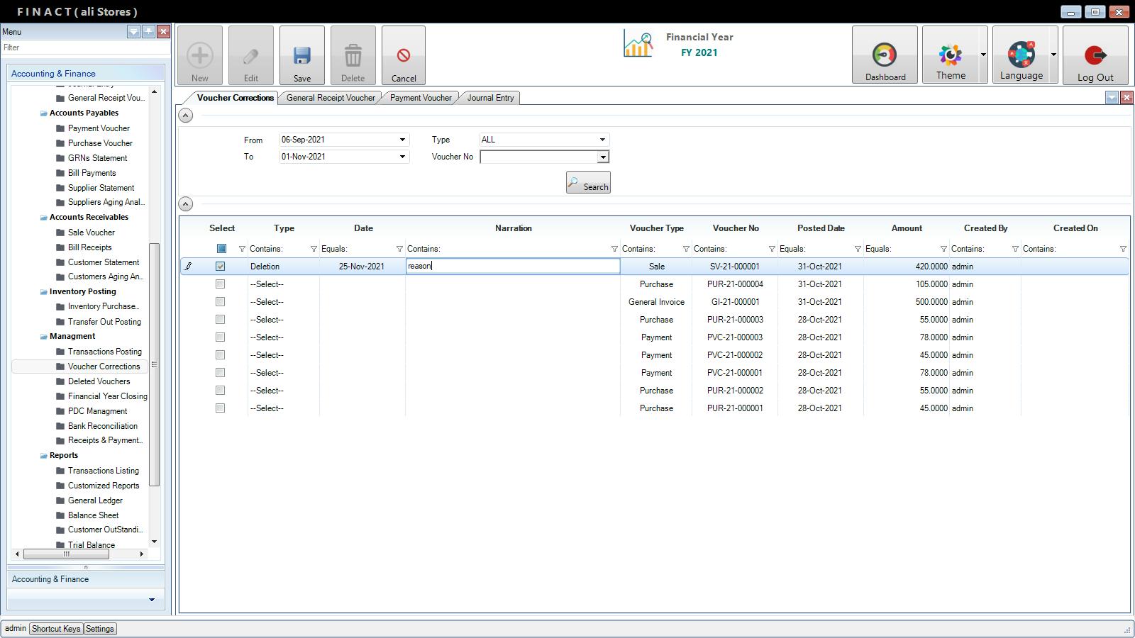 Search your voucher by selecting “from” and “to” date, click on Search button, now select the voucher you want to correct, choose from the “Type” column whether you want to reverse the voucher or delete it.