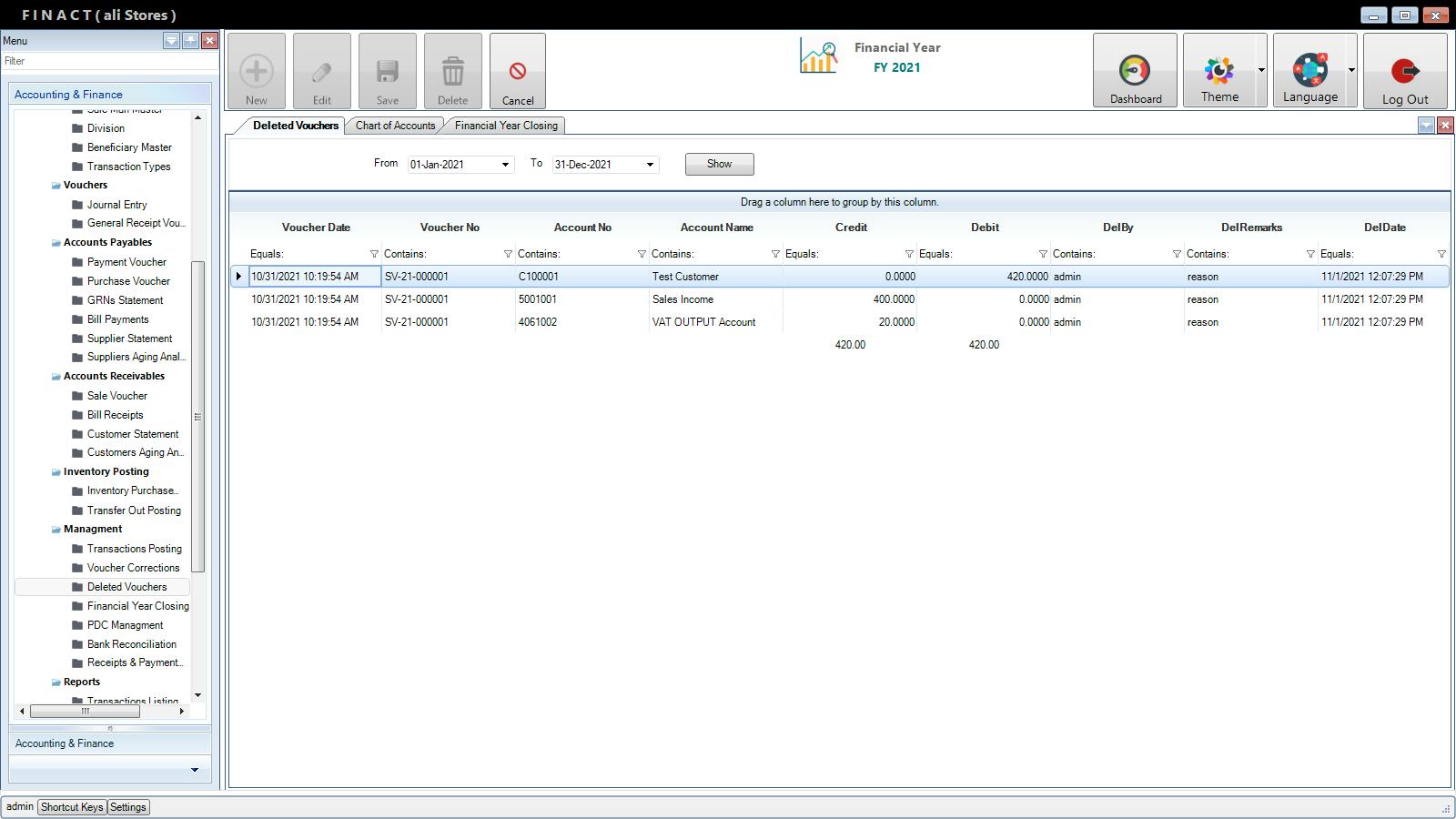 Deleted logs can be viewed in the “Deleted Voucher” form, you can choose the dates of the deletion of the form, press on show to see the deleted forms on that date.