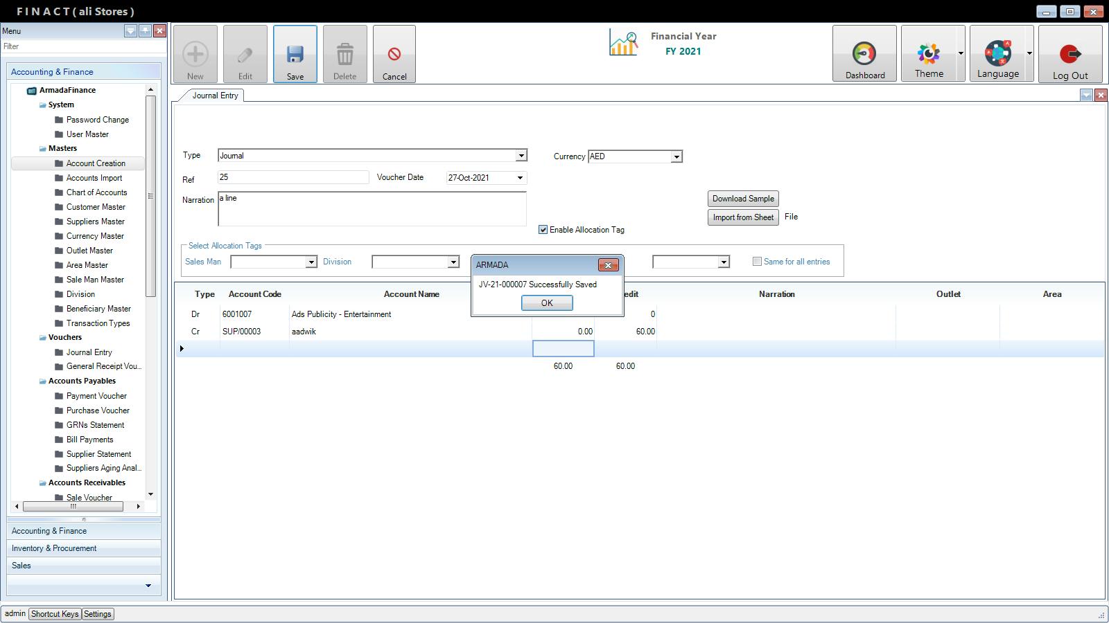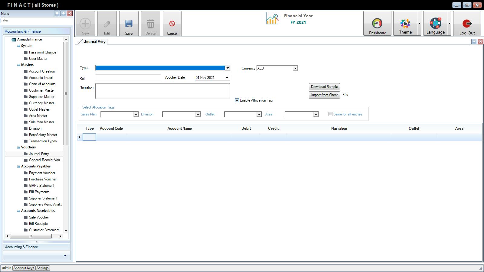 To make a new voucher click on new at the top, choose the type of the voucher whether it’s Journal, Debit note, Credit note or any other type, fill in the reference number in “Ref”, the date will be the date of the day, you may write an explanation of the voucher in the narration field, by Enabling the allocation tag, you may choose any outlet or the call center you need.