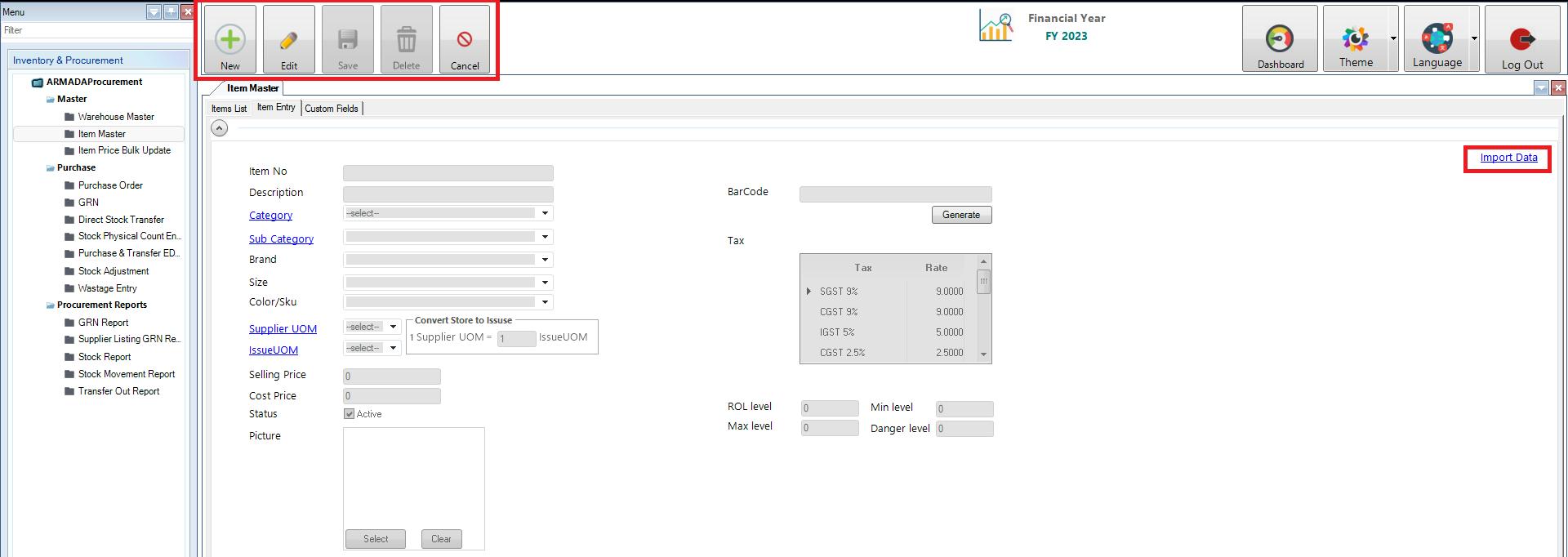 - Using Import Data user can import large number of Item or Data in one click by using this option. For that the user just need Excel sheet and the excel sheet need to fill with the item details in a required format.