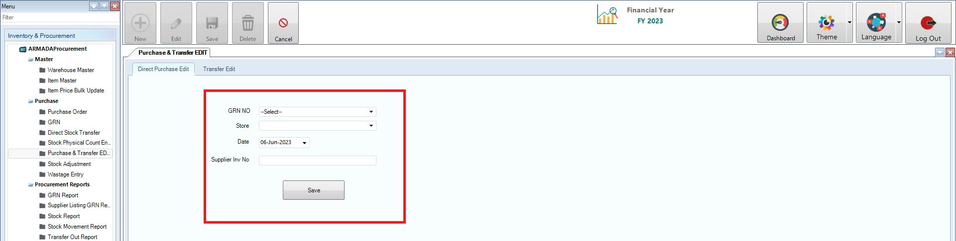 Inventory & Procurement>Purchase >Purchase & Transfer Edit