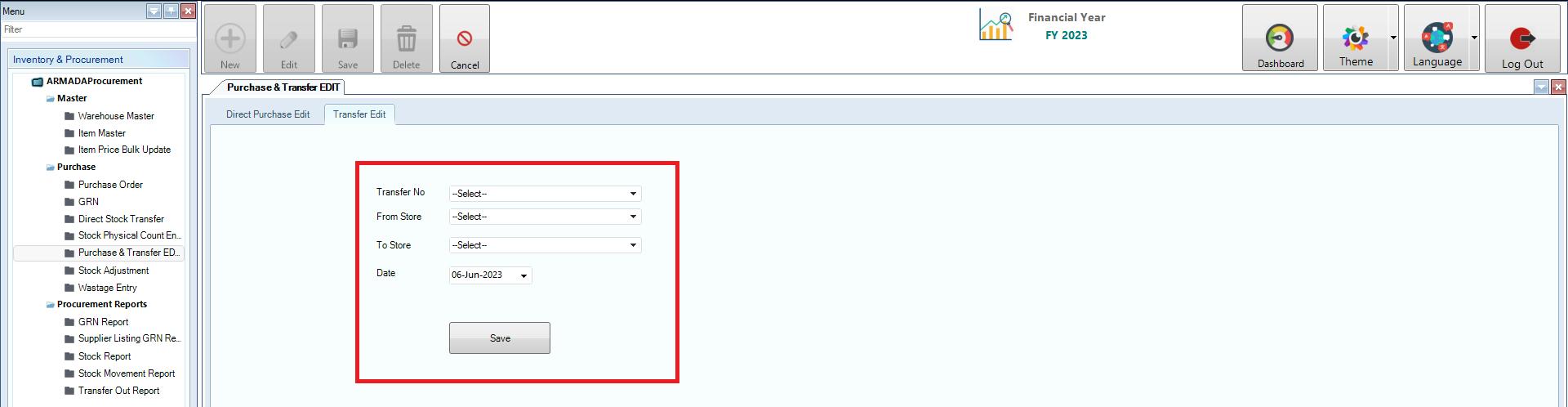 - In Transfer Edit you can Edit the Direct Stock Transfer by choosing the Transfer Number and from and to store select the date and click the save button to save the Data.